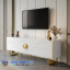 Bufet TV Minimalis Mewah berwarna putih dengan tekstur garis vertikal dan kaki besi finishing gold yang memberikan kesan premium dan ringan secara visual.