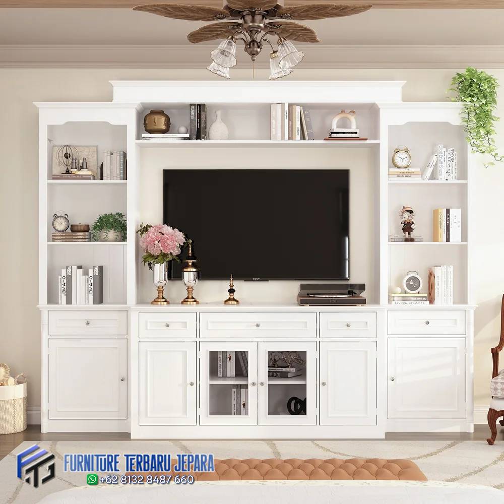 Hadirkan sentuhan elegan dan rapi di ruang keluarga Anda dengan dengan Lemari TV Terbaru Ruang Tamu Minimalis desain elegan bergaya Scandinavian. Rak dibuat menggunakan kombinasi kayu finishing putih yang memberikan kesan hangat dan bersih.