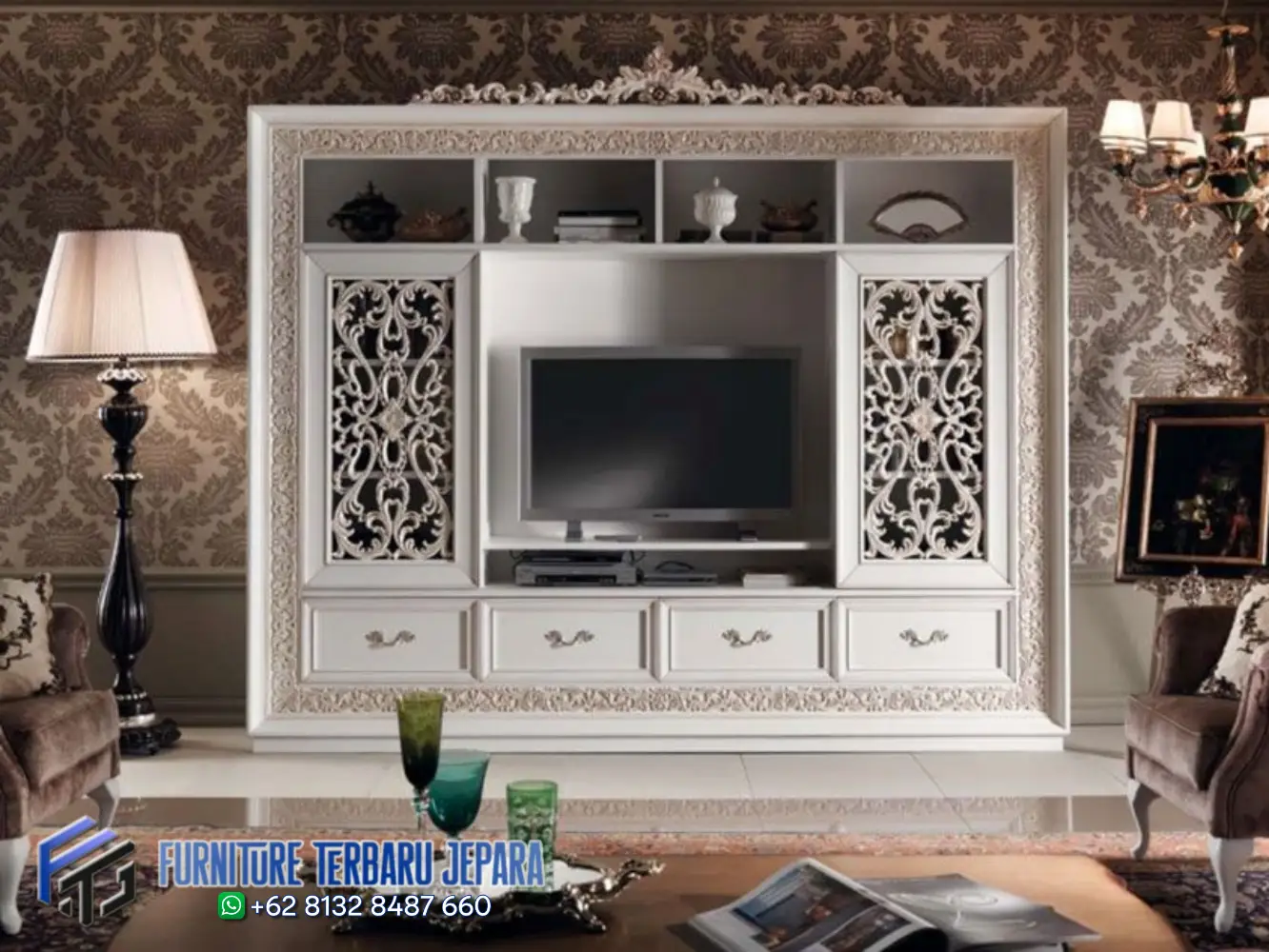 Kami siap membantu Anda mewujudkan Model Lemari TV Bufet Klasik Jepara Terbaru impian yang berkelas, fungsional, dan memikat. Langsung produksi dari Jepara dan siap kirim ke seluruh Indonesia.