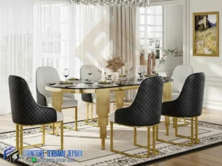 Meja makan dengan rangka stainless menghadirkan kesan mewah dan modern tanpa harus berlebihan. Permukaannya yang mengilap atau finishing doff memberikan sentuhan elegan dan bersih, yang sangat cocok untuk desain interior minimalis hingga kontemporer.